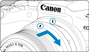 - Wyrównaj czerwony wskaźnik mocowania na obiektywie z czerwonym wskaźnikiem mocowania na aparacie, a następnie obróć obiektyw w kierunku wskazanym strzałką aż do jego zablokowania.