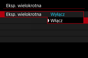 - W przypadku opcji [Cały czas] fotografowanie z ekspozycją wielokrotną będzie działało do czasu zmiany ustawienia z punktu 2 na [Wyłącz].
