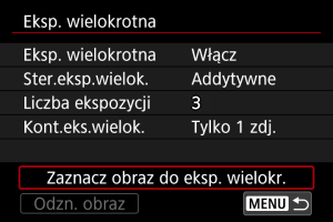 Opcja [Zaznacz obraz do eksp. wielokr.] umożliwia wybór pierwszej pojedynczej ekspozycji z obrazów zapisanych na karcie (). Nie możesz łączyć wielu obrazów już zapisanych na karcie.