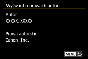 - Jeśli wpis parametru „Autor” lub „Prawa autorskie” jest długi, może nie być wyświetlany w całości po wybraniu opcji [Wyśw.inf.o prawach autor.].