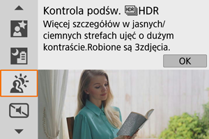 HDR), aby fotografować sceny oświetlone od tyłu z jasnymi i ciemnymi obszarami. Jednokrotne wykonanie zdjęcia w tym trybie powoduje wykonanie trzech kolejnych zdjęć przy różnych wartościach ekspozycji. Następnie są one łączone w celu utworzenia pojedynczego obrazu HDR, który zachowuje szczegóły w cieniach — w przeciwnym razie mogłyby one zostać utracone w wyniku podświetlenia.