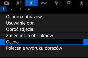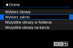 : Ocena] i opcji [Wszystkie obrazy w folderze] lub [Wszystkie obrazy na karcie] spowoduje ocenę wszystkich obrazów w folderze lub na karcie.
