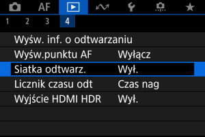 Można nanieść siatkę na zdjęcia widoczne w wyświetlaniu pojedynczego obrazu na ekranie odtwarzania filmu. Funkcja ułatwia sprawdzenie przesunięcia w pionie i w poziomie oraz kompozycji obrazu.