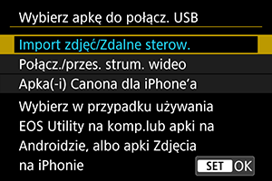 Wybierz jeśli zamierzasz skorzystać z EOS Utility po podłączeniu do komputera lub jeśli użyjesz dedykowanych aplikacji systemu Android lub aplikacji Photos w wersji na iOS.