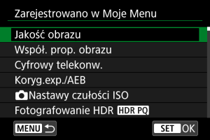 Umożliwia zmianę kolejności pozycji zapisanych na ekranie Moje menu. Wybierz [Sortuj zarejestrowane pozycje], wybierz pozycję, którą chcesz umieścić w innym miejscu i naciśnij przycisk