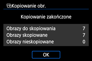 Jeśli w folderze docelowym lub na karcie znajduje się już obraz o tym samym numerze pliku, wyświetlane są opcje [Pomiń obraz i kontynuuj], [Zastąp istniejący obraz] i [Przerwij kopiowanie]. Wybierz metodę kopiowania, a następnie naciśnij przycisk