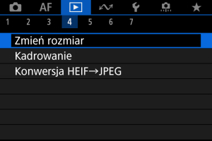 Można zmienić rozmiar obrazu JPEG lub HEIF, aby zmniejszyć liczbę pikseli, a następnie zapisać go jako nowy obraz. Zmiana rozmiaru dostępna jest dla Duży, Średnia lub Mały 1 w formacie JPEG lub HEIF (rozmiary oprócz Mała 2), w tym te ujęte w trybie fotografowania RAW+JPEG i RAW+HEIF. Rozmiar obrazów Mała 2 oraz obrazów RAW i filmów nie można zmniejszać.