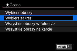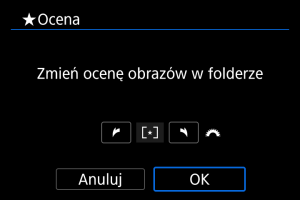 : Ocena] i opcji [Wszystkie obrazy w folderze] lub [Wszystkie obrazy na karcie] spowoduje ocenę wszystkich obrazów w folderze lub na karcie.