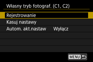 Jeśli zmienisz ustawienie podczas fotografowania we własnym trybie fotografowania, tryb może być automatycznie aktualizowany za pomocą nowego ustawienia (automatyczna aktualizacja). Aby włączyć automatyczną aktualizację, w punkcie 2 dla opcji [Autom. akt.nastaw] wybierz wartość [Włącz].