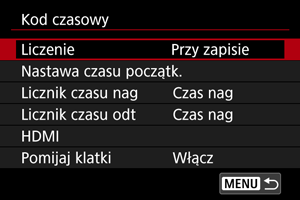 Kod czasowy jest dołączany do filmu odtwarzanego za pośrednictwem wyjściowego sygnału wideo HDMI. Pu wybraniu opcji [Wł.] wyświetlane jest [Polec. nagr.].