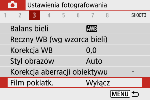 : Film poklatk.] na [Wyłącz] jeśli podłączasz aparat do komputera za pomocą kabla interfejsu i korzystasz z oprogramowania EOS Utility (oprogramowanie EOS). Opcje inne niż [Wyłącz] uniemożliwią połączenie aparatu z komputerem.