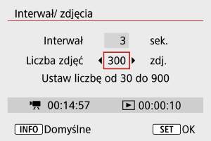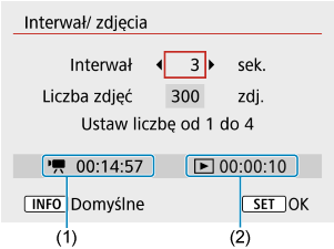 Oznacza ilość czasu konieczną do zarejestrowania wybranej liczby zdjęć przy zastosowaniu ustawionego interwału. Jeżeli wartość przekracza 24 godziny, zostanie wyświetlone wskazanie „*** dni”.