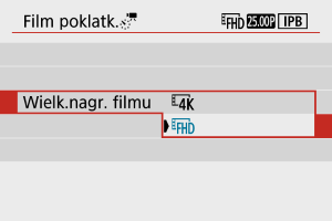 - Czas odtwarzania ([Czas odtwarz.]) wyświetlany jest na czerwono jeśli ustawienie [Liczba zdjęć] będzie skutkować plikiem, którego rozmiar będzie przekraczać 4 GB na karcie, na której nie przeprowadzono formatowania exFAT (). W przypadku dalszego nagrywania w takiej sytuacji i osiągnięcia przez plik filmu rozmiaru 4 GB nagrywanie filmu poklatkowego zostanie zatrzymane.