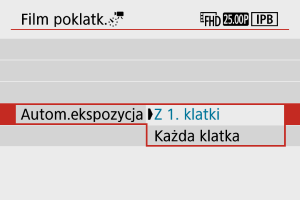 - Przy ustawieniu [Każda klatka] dla [Autom.ekspozycja], czułość ISO, czas naświetlania i wartość przysłony mogą nie być zapisane w danych Exif filmu poklatkowego w niektórych trybach fotografowania.