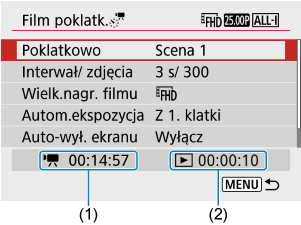 Oznacza czas nagrania filmowego (czas wymagany do odtworzenia filmu) w przypadku tworzenia filmu poklatkowego w jakości 4K lub Full HD ze zdjęć wykonanych z wykorzystaniem wyznaczonych odstępów czasu.