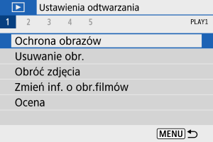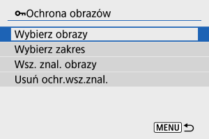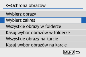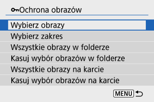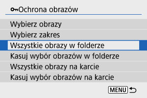 - Aby anulować ochronę, wybierz opcję [Kasuj wybór obrazów w folderze] lub [Kasuj wybór obrazów na karcie].
