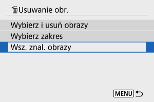 - W przypadku wybrania opcji [Wsz. znal. obrazy] wszystkie obrazy przefiltrowane według kryteriów zostaną usunięte.