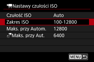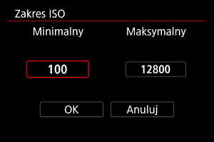 Istnieje możliwość skonfigurowania zakresu ręcznej regulacji czułości ISO (Minimalny/Maksymalny).