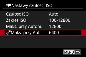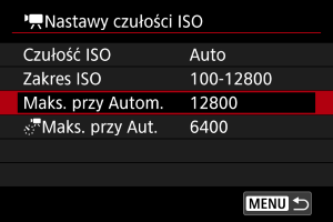 ] z funkcją automatycznej regulacji czułości ISO. Domyślnie, górny limit ustawiony jest na ISO 6400. Górny limit można ustawić w zakresie ISO 400–12800.
