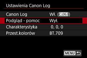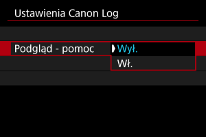 : Ustawienia Canon Log] ustawionymi na [Wł. (