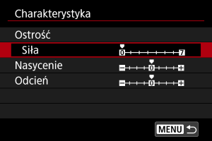 Ustaw zgodnie z wymaganiami. Wybierz opcję ([Ostrość: Siła], [Nasycenie] lub [Odcień]), wyreguluj poziom efektu i naciśnij przycisk .