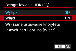 : Fotografowanie HDR (PQ)] ustawiono na [Włącz].
