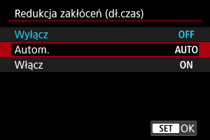 Redukcja szumów jest stosowana dla wszystkich obrazów zarejestrowanych z czasem ekspozycji równym 1 sek. lub dłuższym. Ustawienie [Włącz] może zmniejszyć szumy, które mogą nie być wykrywane w przypadku ustawienia [Autom.].