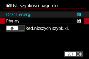 Można ustawić prędkość nagrywania na ekranie fotografowania podczas robienia zdjęć. Można wybrać, czy ma być oszczędzana energia akumulatora, czy nagrywanie ma odbywać się z dużą prędkością.