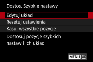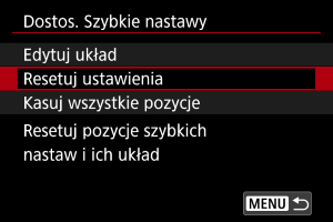 - Wybierz opcję [Kasuj wszystkie pozycje], aby usunąć wszystkie elementy z układu, dzięki czemu ekran szybkich nastaw nie będzie wyświetlany nawet po naciśnięciu przycisku