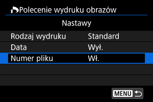 - W przypadku wydruków [Miniatury] dla obu pozycji [Data] i [Numer pliku] nie można wybrać opcji [Wł.] w tym samym czasie.