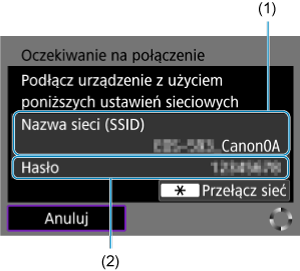 - Sprawdź identyfikator Nazwa sieci (SSID) (1) i Hasło (2) wyświetlane na ekranie kamery.