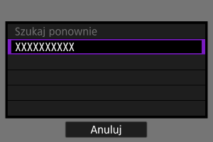 - Jeśli preferowanej drukarki nie ma na liście, wybranie opcji [Szukaj ponownie] może umożliwić kamerze jej znalezienie i wyświetlenie.