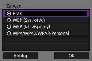 - Ten sam typ zabezpieczeń musi być ustawiony zarówno na drugim urządzeniu, jak i na kamerze. Szczegółowe informacje na temat typów uwierzytelniania i szyfrowania można znaleźć w części Metody uwierzytelnienia i szyfrowania.