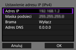 Skonfiguruj ustawienia adresu IP ręcznie. Należy pamiętać, że wyświetlane elementy różnią się w zależności od funkcji komunikacji.