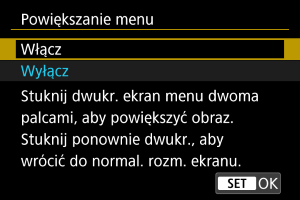 Ekrany menu można powiększać, stukając je dwukrotnie dwoma palcami. Ponowne dwukrotne stuknięcie przywraca pierwotny rozmiar wyświetlania.