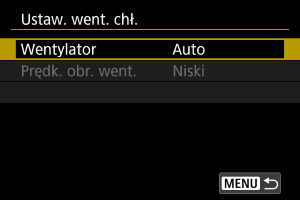 - Podczas pracy w wysokich temperaturach i innych warunkach fotografowania wentylator chłodzący może się nie zatrzymać nawet po ustawieniu opcji [Auto].