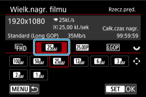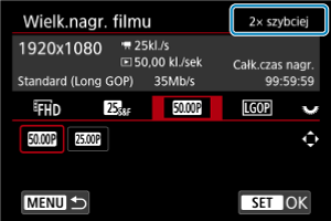 Filmy nagrane przy użyciu funkcji nagrywania w zwolnionym lub przyspieszonym tempie są odtwarzane w zwolnionym lub przyspieszonym tempie. Dźwięk nie jest nagrywany. Ustaw szybkość odtwarzania w zwolnionym lub przyspieszonym tempie w menu [: Wielk.nagr. filmu].