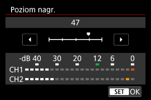 - Poziomy nagrywania są wyświetlane na mierniku poziomu w dolnej części ekranu.