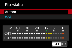 Ustaw na [Autom.], aby zredukować zniekształcenia dźwięku w nagraniach w wietrznych warunkach. Podczas działania funkcji filtru wiatru część niskich dźwięków także zostanie zredukowana.