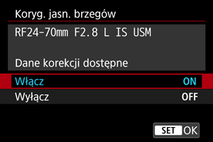 - W przypadku korzystania z obiektywu firmy innej niż Canon zaleca się ustawienie wartości [Wyłącz], nawet jeśli zostanie wyświetlony komunikat [Dane korekcji dostępne].