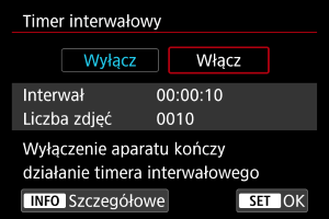 - Aby zatrzymać fotografowanie z samowyzwalaczem interwałowym, wybierz [Wyłącz] albo ustaw przełącznik zasilania w pozycji