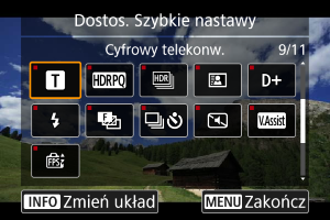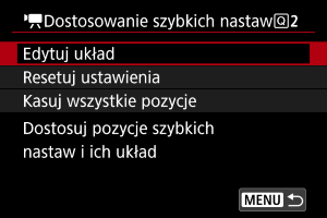 - Wybierz [Kasuj wszystkie pozycje] aby usunąć wszystkie elementy z układu, aby ekran szybkich nastaw nie był wyświetlony, nawet gdy naciśnięty jest przycisk