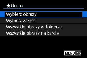 : Ocena] i opcji [Wszystkie obrazy w folderze] lub [Wszystkie obrazy na karcie] spowoduje ocenę wszystkich obrazów w folderze lub na karcie.