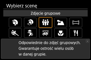 Użyj funkcji [] (Zdjęcie grupowe), aby robić zdjęcia grupowe. Możesz fotografować osoby z przodu i z tyłu z odpowiednią ostrością.