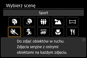 Użyj trybu [] (Sport), aby fotografować obiekty w ruchu, takie jak biegaczy lub przemieszczające się pojazdy.