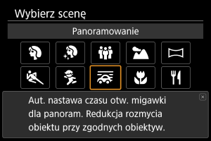 - Czasy naświetlania są wolniejsze. Z tego powodu, tryb Panoramowanie nie będzie odpowiedni, jeżeli podczas fotografowania nie korzystasz z panoramowania.