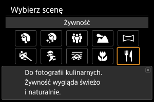 Użyj [] (Żywność) do fotografowania potraw. Zdjęcie będzie jasne i wyglądać będzie atrakcyjnie. Redukuje również czerwonawy odcień światła żarówek lub podobnych źródeł światła.