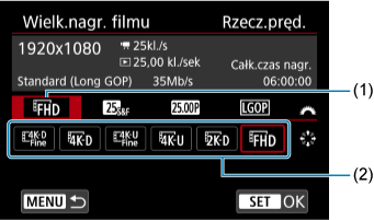 Filmy można nagrywać w celu odtwarzania w zwolnionym lub przyspieszonym tempie. Dźwięk nie jest nagrywany. Ustaw szybkość odtwarzania w zwolnionym lub przyspieszonym tempie w menu [: Wielk.nagr. filmu].