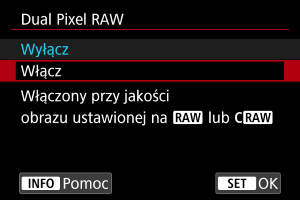 - Zostanie zarejestrowany obraz RAW z danymi w technologii Dual Pixel (obraz Dual Pixel RAW).
