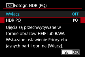 [Fotogr. HDR (PQ)] umożliwia rejestrowanie obrazów o wysokim zakresie dynamicznym, które zachowują szczegóły w jasnych i ciemnych obszarach oraz są zgodne ze specyfikacją PQ (odnoszącymi się do krzywej gamma sygnału wejściowego dla wyświetlania obrazu HDR) zdefiniowanymi w ITU-R BT.2100 i SMPTE ST.2084.